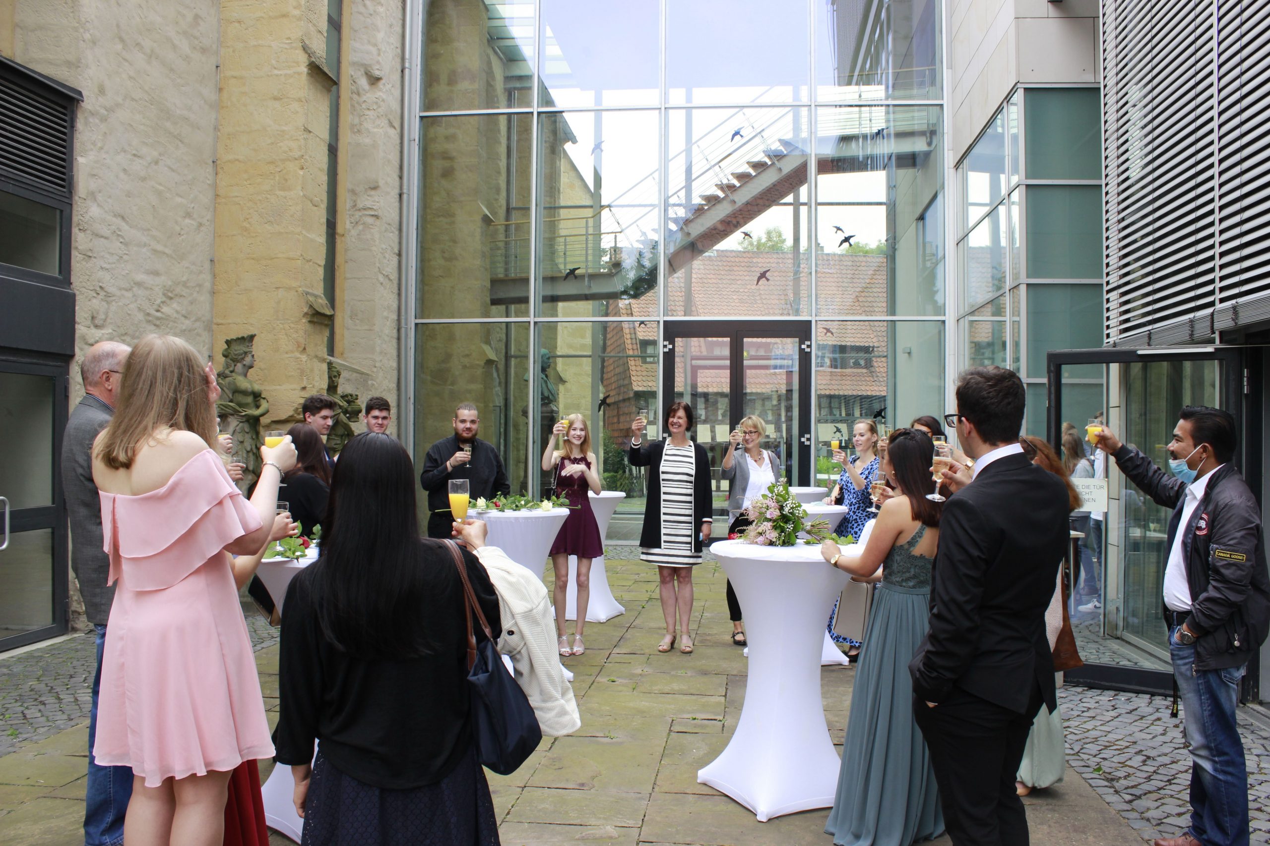Beim anschließenden Sektempfang im von Sonnenlicht durchfluteten Innenhof des Museums luden ehrenamtliche Helfer aus den 11.Klassen die Absolventen und ihre Gäste noch zum Anstoßen mit einem Getränk ein.
